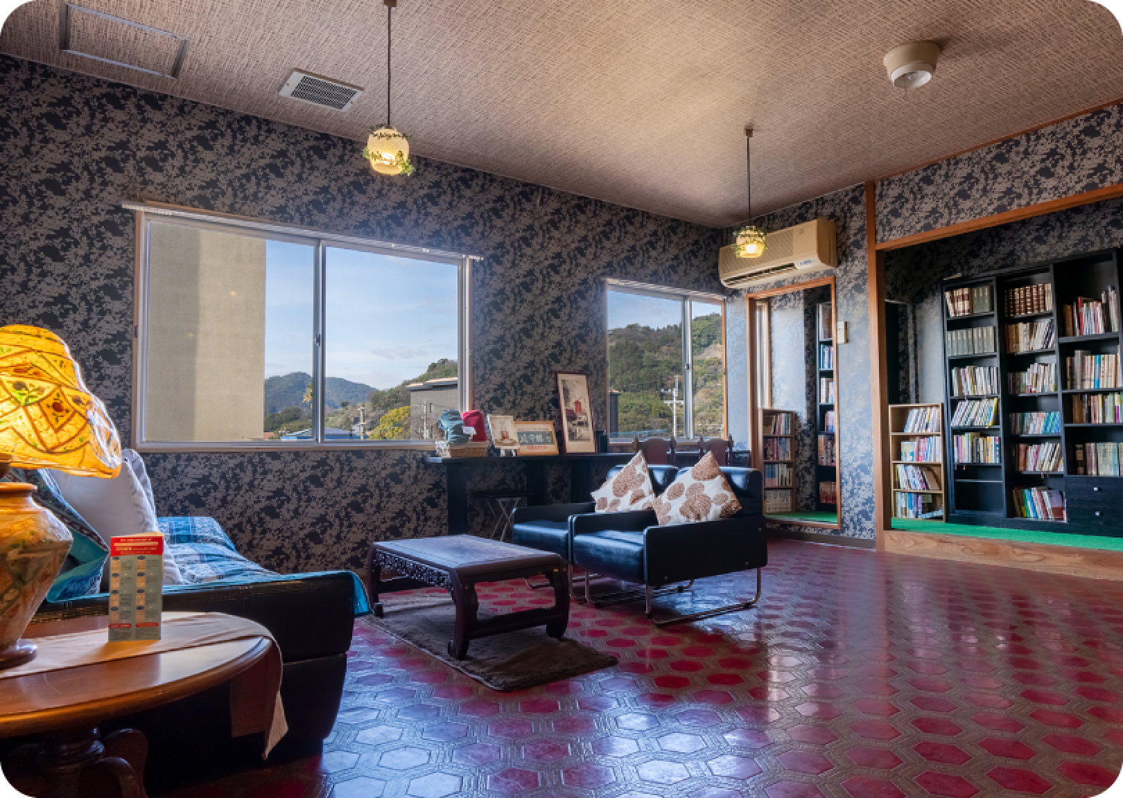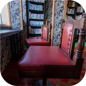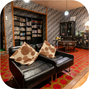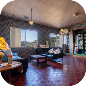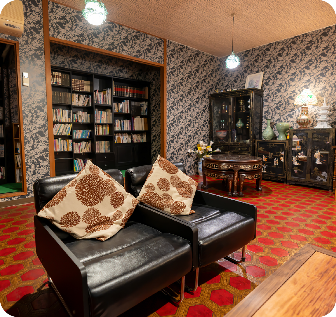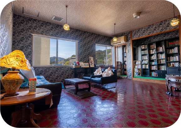 3階の宿泊者専用パブリックスペース。レトロな雰囲気の中、本や無料のコーヒーをお楽しみいただけます。いろんな本との触れ合いや他の お客様との交流の場として、ご自由にご利用くださいませ。