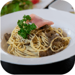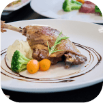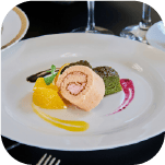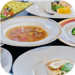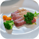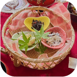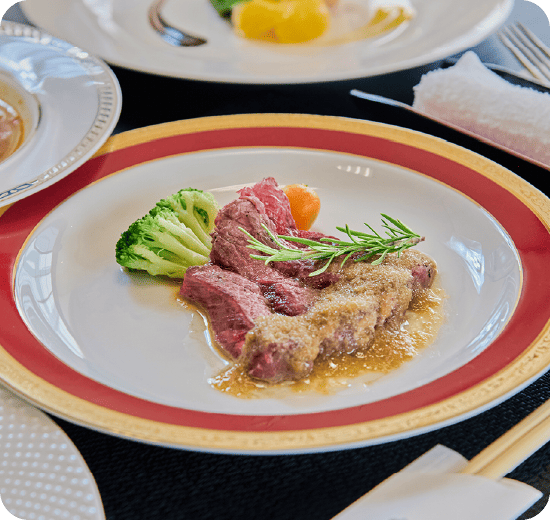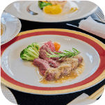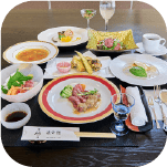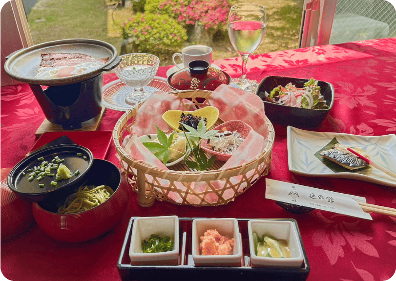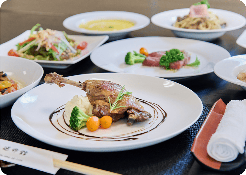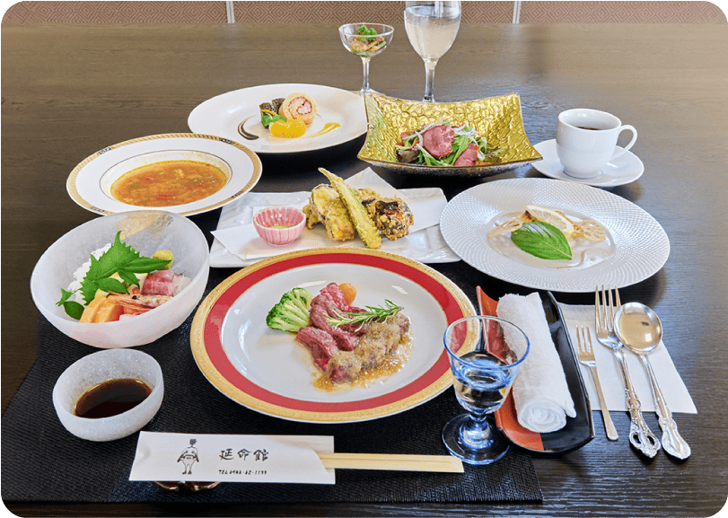 延命館の夕食は和洋テイストを織り交ぜた創作料理。料理長が厳選した地元の食材を使用し、一品ずつ心を込めたお料理で旅を彩ります。季節の移り変わりを感じながら、自慢のお料理をお楽しみください。